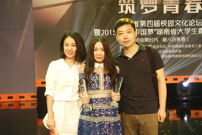6月11日晚, 2015“我的中国梦”湖南省第二届大学生微电影节在湖南教育电视台演播厅举行。副省长李友志出席并宣布第三届微电影大赛启动,省委宣传部副部长宋智富致辞。我院影视系12级编导班学生刘晶晶导演、11级编导班学生沈哲摄像,教师张睿、马千里、刘翔指导的微电影《等风来》荣获“最佳导演奖”、“最佳摄像奖”, 12级高职摄像班学生高航导演,教师陈俊、周晓军、刘少鹏指导的微电影《满江红》荣获“最受欢迎影片奖”、“最佳人气奖”,学院荣获“优秀组织奖”。