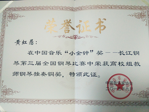 近日,从中国音乐家协会传来喜讯,我系教师黄虹愚喜获“中国音乐‘小金钟’奖—长江钢琴第三届全国钢琴比赛”高校教师组铜奖。黄虹愚是本次比赛唯一来自高职院校的获奖老师。