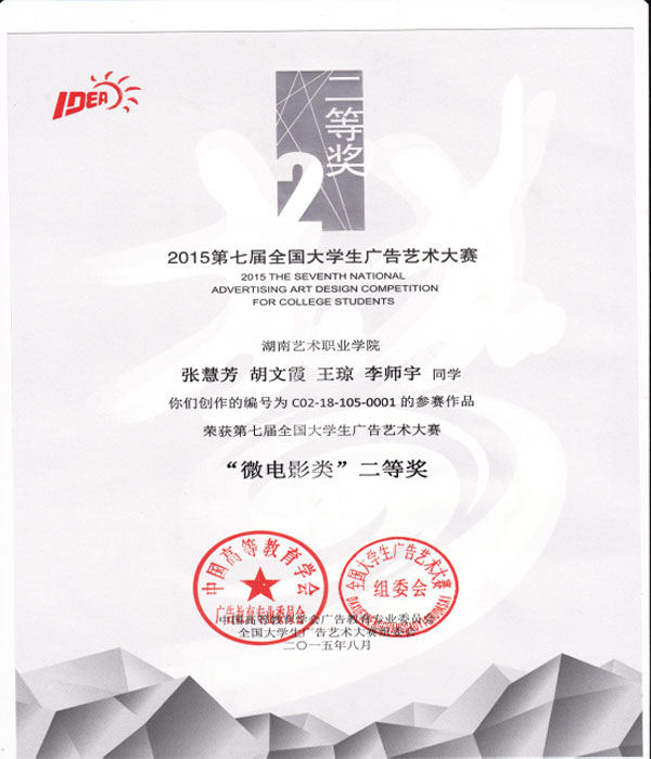 11月21日,第七届全国大学生广告艺术大赛颁奖典礼在全国政协礼堂隆重举行,我院微电影广告《心相印 爱相随》荣获 “微电影类”二等奖。作品由影视系张睿、马千里老师指导,张慧芳、胡文霞、王琼、李师宇同学共同创作。