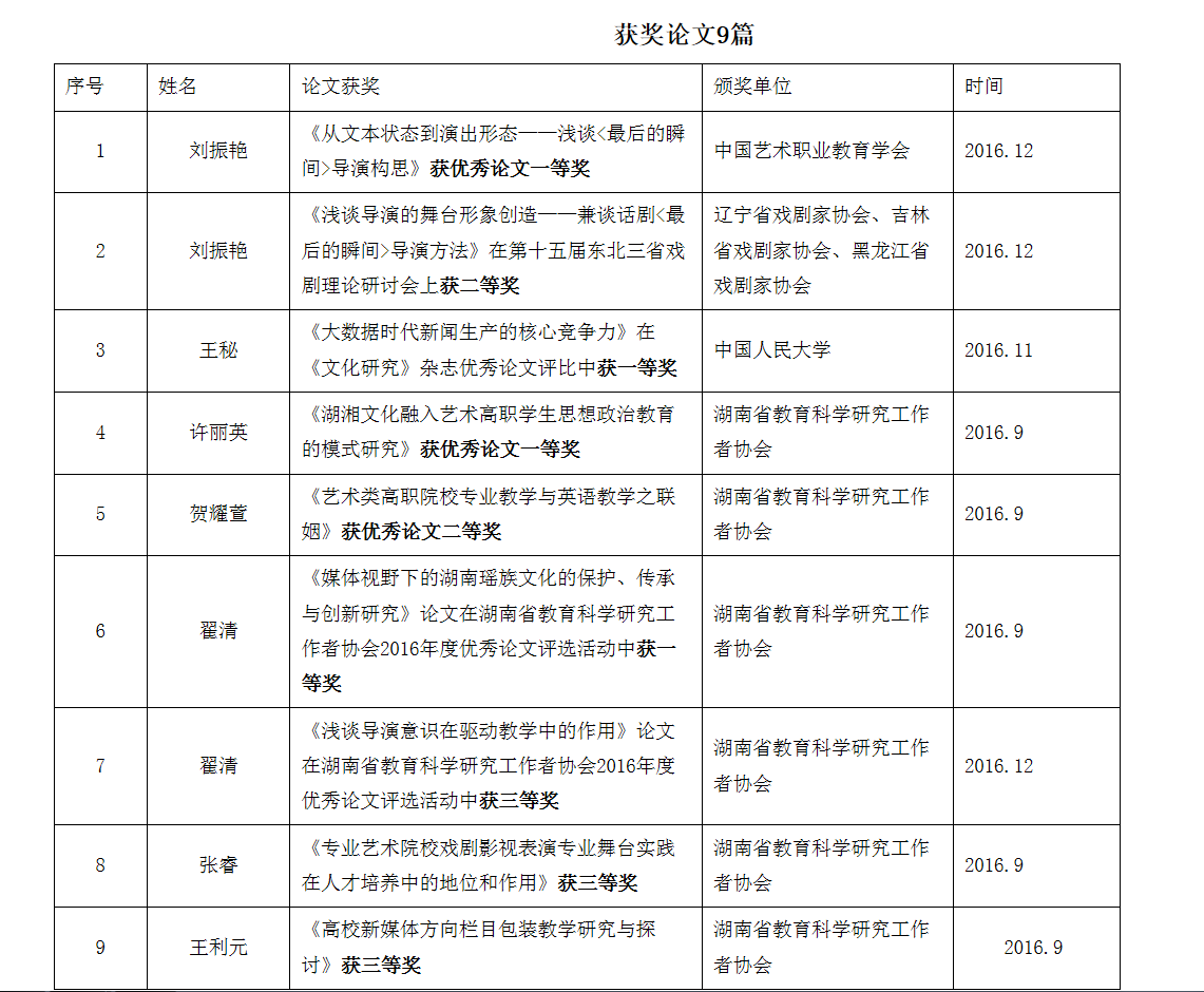 30 | 张睿 | 微电影《等风来》荣获湖南省首届职业院校公益视频大赛评委会特别奖 | 湖南省职业教育与成人教育学会 | 2016.10 | 省级 | |