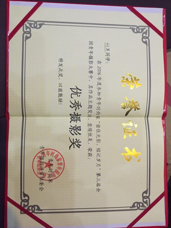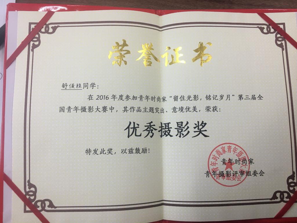 在2016年度青年时尚家“留住光影、铭记岁月”第三届全国青年摄影大赛中,影视系共有三名同学获奖,分别是来自15高摄舒俊程、刘其,15多媒体刘为同学,他们的摄影作品因主题突出、意境优美,荣获“优秀摄影奖”。