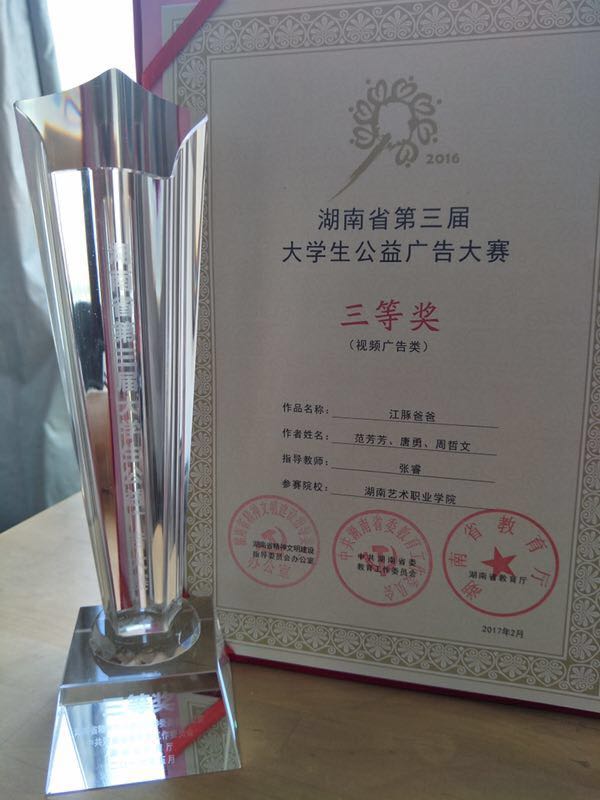 近日,湖南省第三届大学生公益广告大赛评审结果公示,我院影视系张睿老师指导,范芳芳、唐勇、周哲文同学创作的《江豚爸爸》荣获视频广告类三等奖。