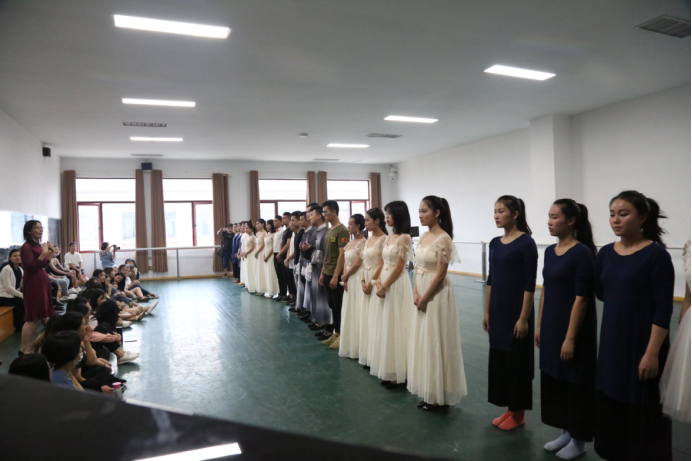 6月20日下午,影视系13影表和15高表的同学在文化楼513教室进行2017年上学期声乐、形体阶段性教学汇报演出。教务处副处长周新娟、系副主任张舸、表演台词教研室和声乐形体教研室所有老师和部分学生观看了汇报演出。