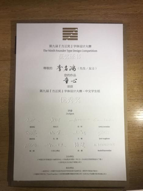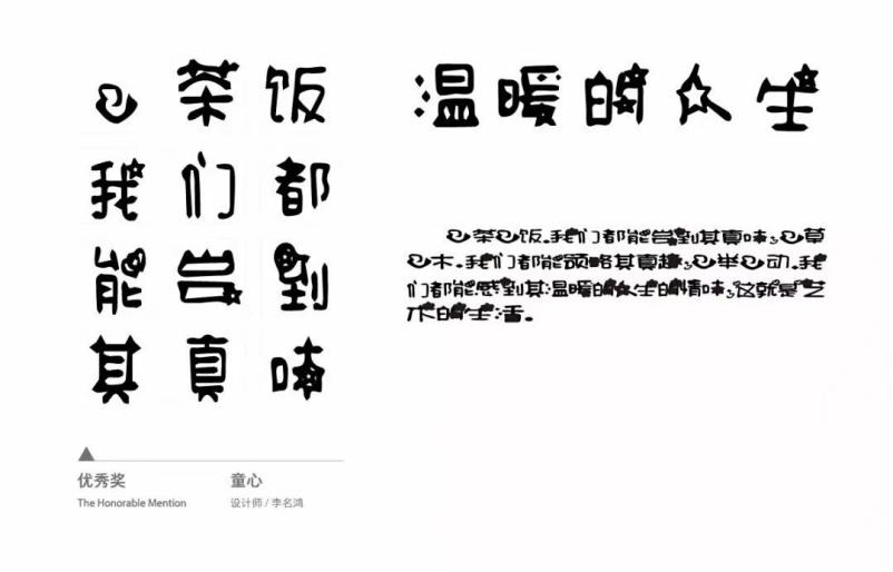 此次比赛由中国文字字体设计与研究中心、中央美院主办,纽约TDC、中国中文信息学会汉字字形信息专业委员会协办。从2001年至今已成功举办了八届。秉承着弘扬中华民族古老汉字文化,带动中西文化的交流与融合,发现优秀字体设计人才的宗旨,让每一位钟情文字艺术的字体爱好者 ,都能在这里展示自己的才能。感受中国字体的深厚内涵。李名鸿同学在其专业老师陈可倪的指导下,凭借着作品《童心》荣获中文学生组优秀奖。