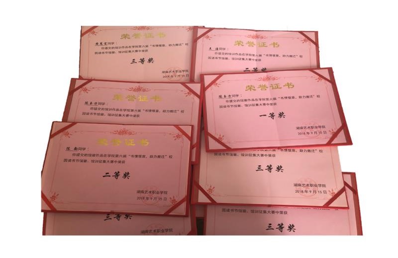 为了丰富校园文化生活,创建文明高校,学院举办了第六届“书情惬意,助力搬迁”校园读书节系列活动。影视系学生踊跃参与馆徽、馆训征集大赛。此次比赛从4月初启动,6月底截止,期间全院师生踊跃参加,共征集到师生作品242件,其中,馆徽作品124枚,馆训作品118条,经专家评审组评选,评选出特等奖作品1名、一等奖作品1名、二等奖作品2名、三等奖作品5名。