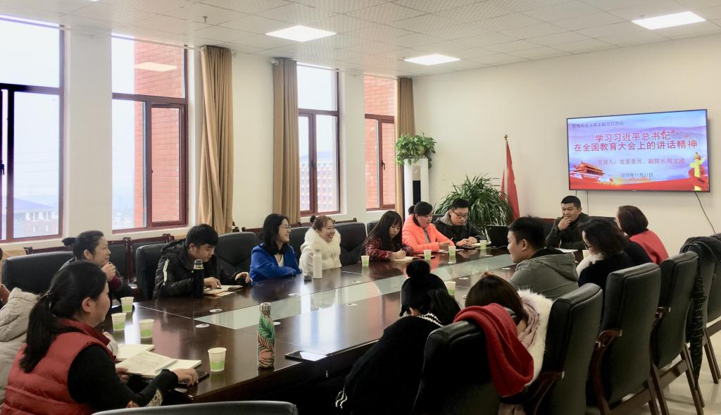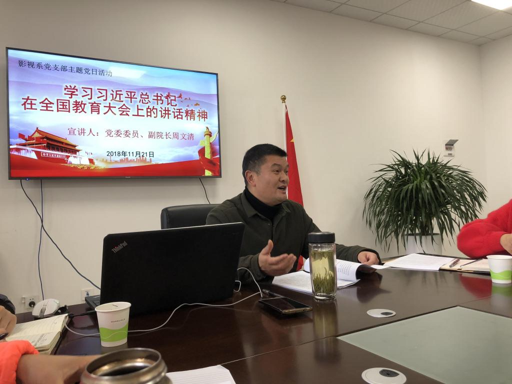 11月21日下午,学院党委委员、副院长周文清在臻艺楼816党员活动室,给影视系党支部全体党员宣讲全国教育大会精神,会议由党支部书记许丽英主持。