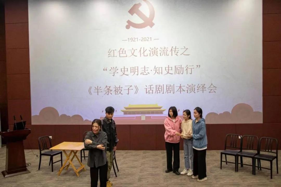 为庆祝中国共产党建党100周年,让红色文化在当代青年学子中广泛流传,铭记党的历史。影视系依托《半条被子》剧目,将课程思政内容融入到专业教学之中,并更好的贯彻“三全育人”教育理念(该剧目成功入选国家教育部思政工作司“高校原创文化精品推广行动计划”,全国仅2所高职院校入选该计划)。2021年3月31日,影视系在臻艺楼4K放映厅举办红色文化演流传之“学史明志·知史励行”《半条被子》话剧剧本演绎会。影视系党支部书记蒋玲、学院科研处副处长周新娟、影视系常务副主任 项目负责人翟清、影视系副主任张舸等领导亲临现场指导。