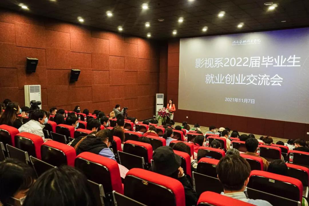 2021年11月7日晚,影视系在4K放映厅举行了2022届毕业生就业创业交流会。学院党委委员、影视系党支部书记蒋玲,党支部副书记、影视系副主任张舸,影视系办公室主任杨盛,全体辅导员老师和2022届毕业班学生代表、团学会干部共同参与本次交流会。