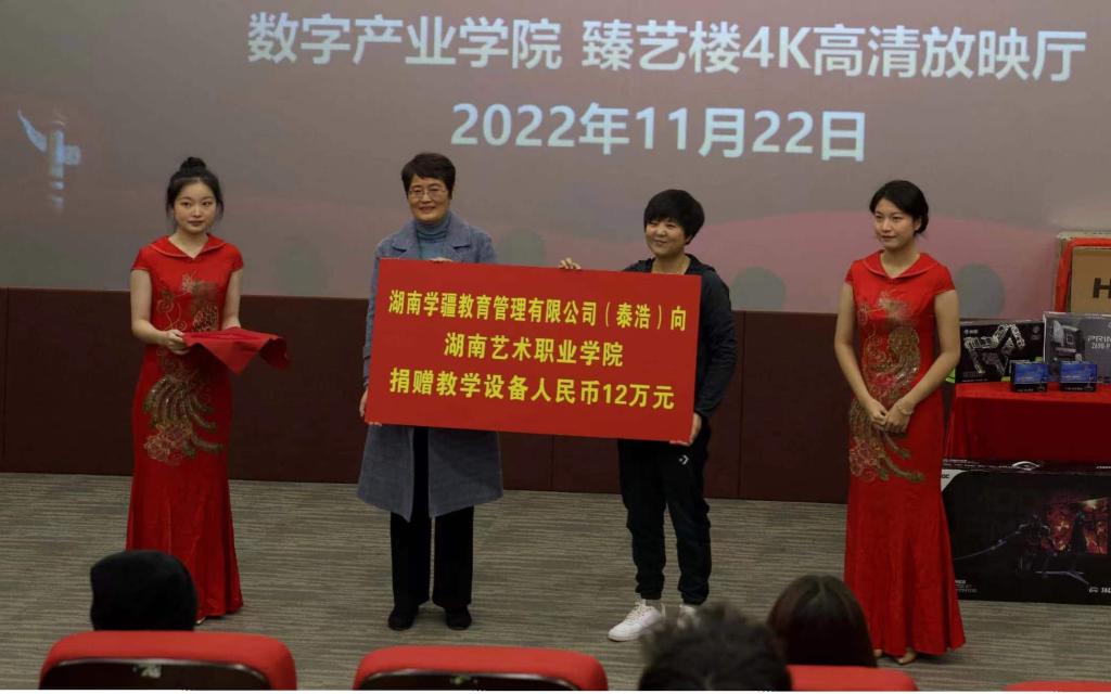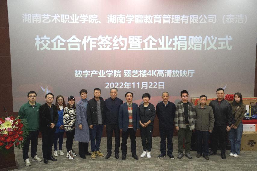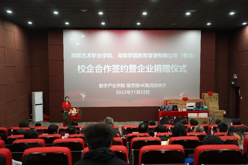 2022年11月22日上午,我院与湖南学疆教育管理有限公司(泰浩)在臻艺楼4K放映厅举行了校企合作签约暨企业捐赠仪式。湖南学疆教育管理有限公司董事长陈婷,泰浩传媒公司股东周晓明、孙婵,伟德国际victor1946党委书记王章华,学院伟的国际1946bv、总务基建处、教务实训处、发展规划处相关负责人,与师生代表共同出席了本次仪式。
