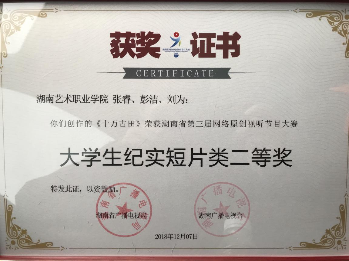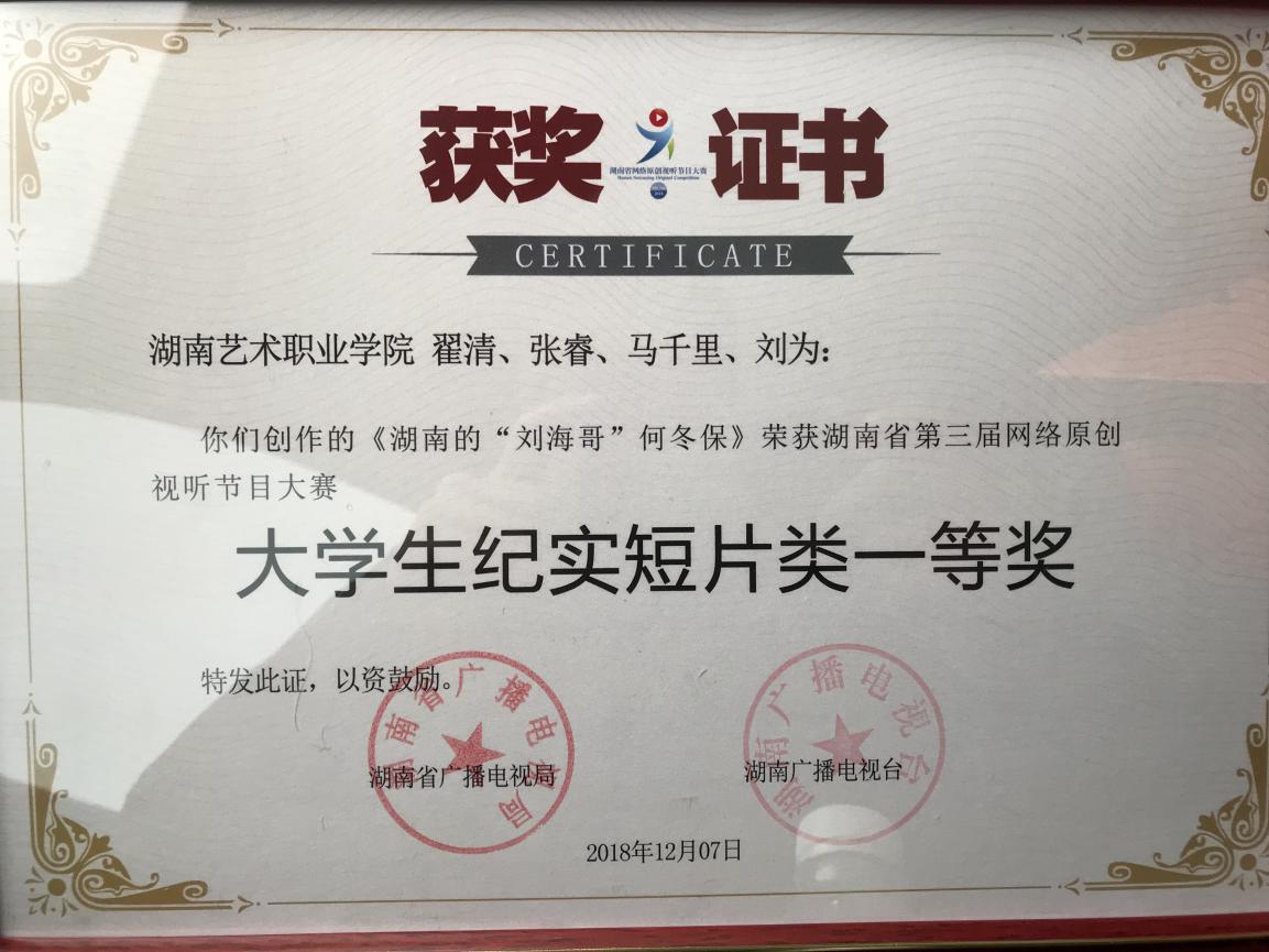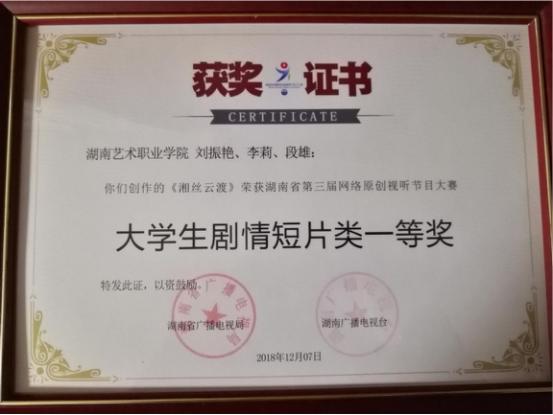 我院影视系翟清、张睿、马千里老师指导的纪录片《湖南的“刘海哥”何冬保》荣获大学生纪实短片类一等奖,刘振艳、李莉、段雄老师指导的微电影《湘丝云渡》荣获大学生剧情短片类一等奖,张睿老师指导的纪录片《十万古田》荣获大学生纪实短片类二等奖,曹琰、黄晓利老师指导的纪录片《麓山南路的风》荣获大学生纪实短片类二等奖。