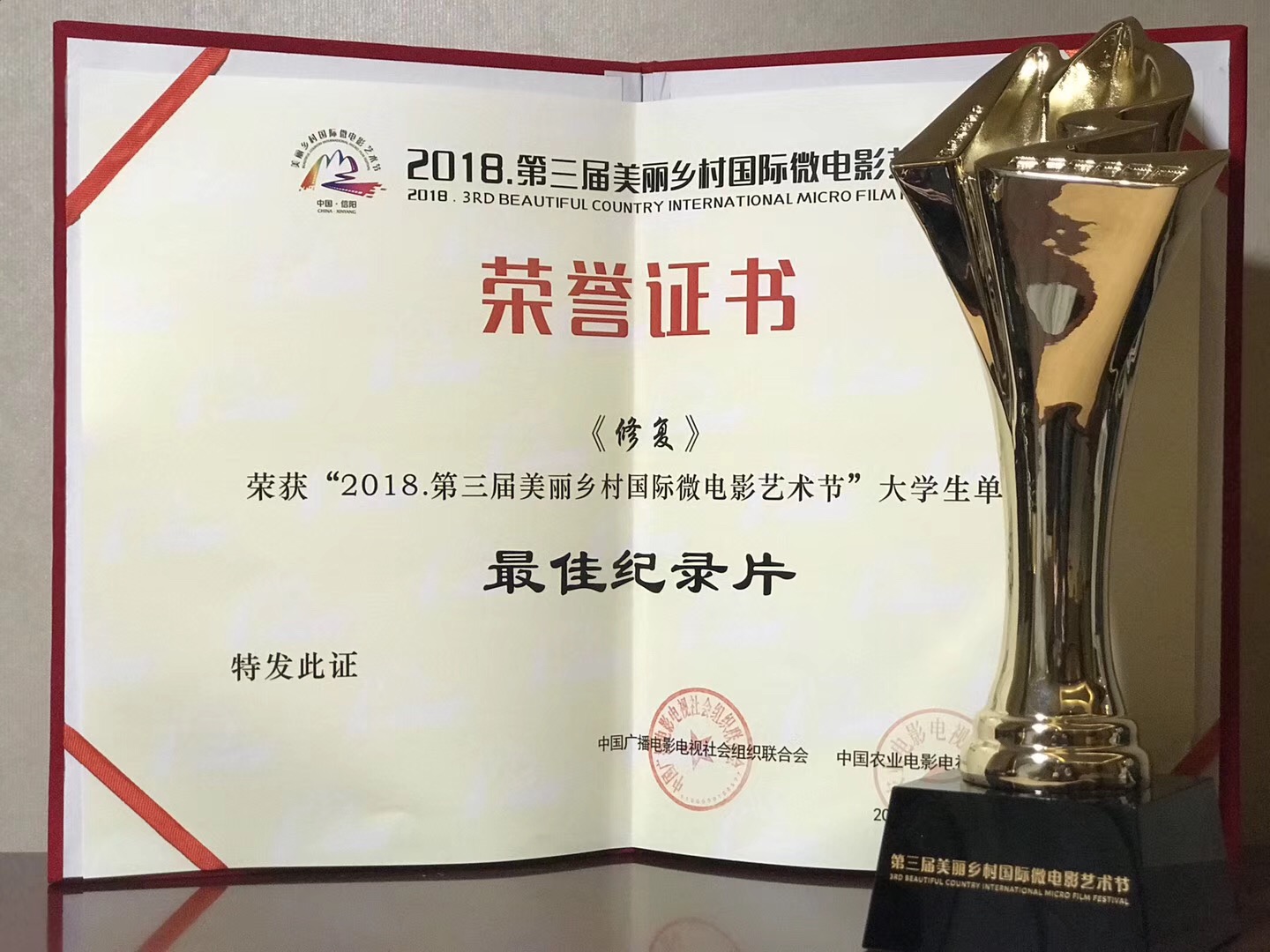 12月2日,由中国广播电影电视社会组织联合会、中国农业电影电视协会(央视农业频道)主办,信阳市人民政府协办的“2018第三届美丽乡村国际微电影艺术节表彰典礼”在河南信阳隆重举行。经过激烈的角逐,我系两部作品成功突出重围获得奖项,分别是由翟清、张睿、马千里老师指导的纪录片《湖南的“刘海哥”何冬保》,和由王密、赵小伟老师指导的纪录片《修复》荣获大学生单元最佳纪录片奖。我校是唯一一所高职院校获奖单位,其他同类奖项分别由北京电影学院、上海戏剧学院、中国戏曲学院等知名高校摘得。