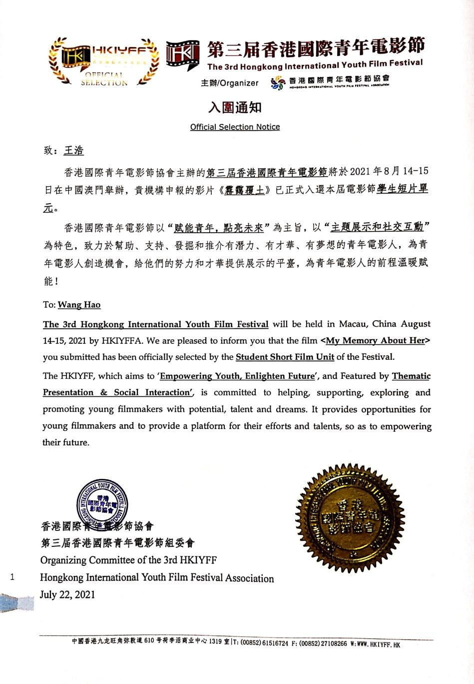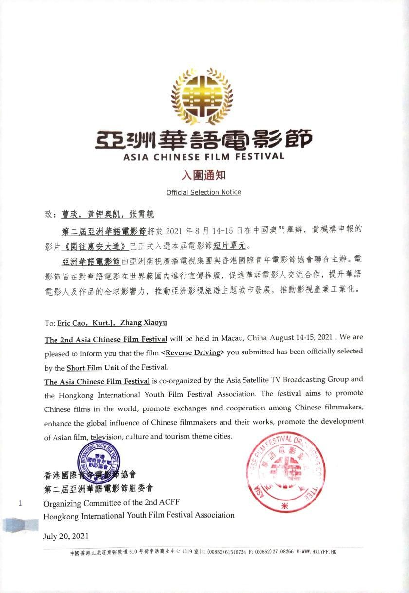 2021年7月23日,第二届亚洲华语电影节、第三届香港国际青年电影节组委会正式公布本届大赛主竞赛单元入围名单,经过激烈的角逐,我院影视系曹琰老师指导,黄钾奥凯、张霄毓、叶玉寒、何亮等同学创作的“抗疫微电影”《开往惠安大道》成功入围第二届亚洲华语电影节短片主竞赛单元;影视系曹琰老师指导,王浩、邓铭松同学创作的剧情短片《雾霭覆土》成功入围第三届香港国际青年电影节学生短片主竞赛单元。