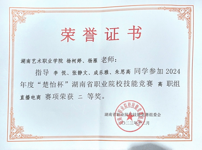 2024年度“楚怡杯”湖南省职业院校技能大赛 “电商直播”赛项在湖南商务旅游职业学院圆满落下帷幕,来自湖南各地高职院校的45支团队伍,180名选手同台竞技。经过激烈角逐,我院派出一支参赛队伍,最终获得该赛项二等奖,指导老师:杨柯婷、杨雁,参赛学生:朱思高、张静文、成乐雅、李悦。
