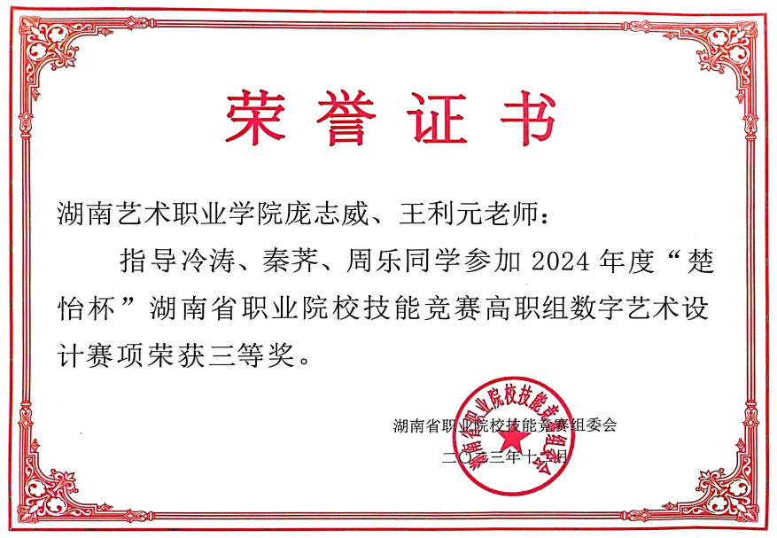 2024年度“楚怡杯”湖南省职业院校技能竞赛“数字艺术设计”赛项在湖南民族职业学院举行,共有25支参赛队按照赛规赛题要求,围绕角色原画模型制作、3D动画制作、视频引擎渲染等模块进行比拼。我校一支队伍最终斩获该赛项二等奖,指导老师:庞志威、王利元,参赛学生:庞志威、王利元。