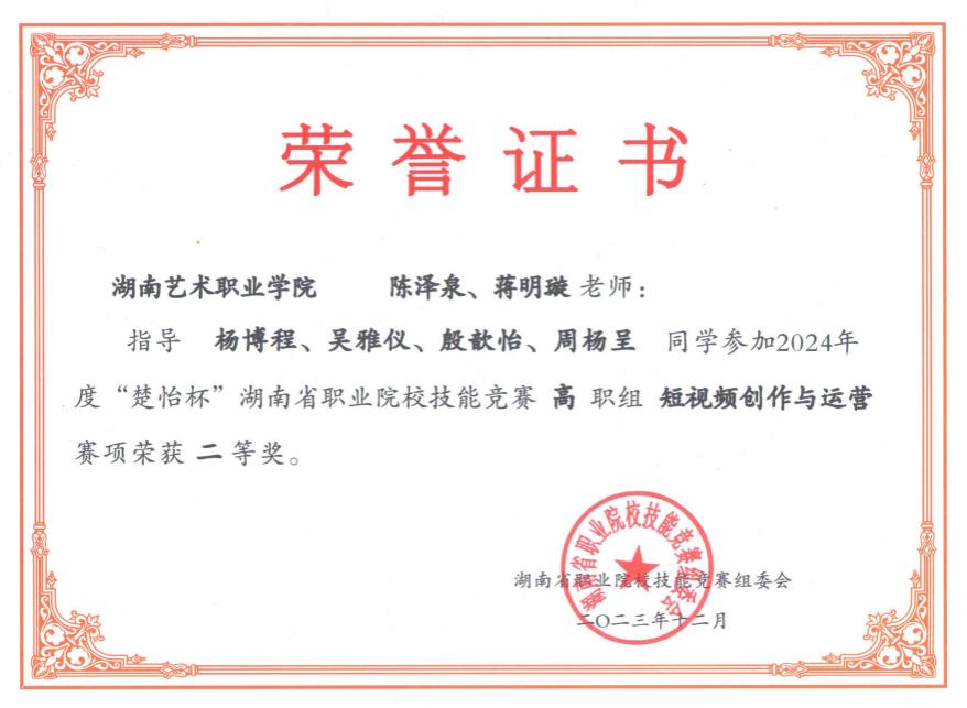 2024年度“楚怡杯”湖南省职业院校技能竞赛高职组 “短视频创作与运营”赛项在湖南机电职业技术学院举行。此次竞赛共有来自全省47所职业院校,92支团队同台竞技,竞争异常激烈。经过四个小时的现场角逐,伟的国际1946bv师生突出重围,斩获佳绩,其中一支队伍摘获二等奖,指导老师:陈泽泉、蒋明璇,参赛学生:杨博程、吴雅仪、殷欣怡、周杨呈。