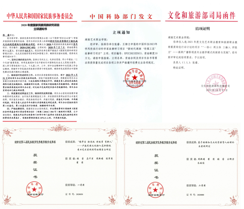实践教学改革成果、科研成果丰硕,主持成果荣获省级民族教育教学成果一等奖1项,省级职业教育教学成果三等奖1项,参与成果荣获国家级教学成果奖二等奖1项;发表论文、剧本60余篇;立项国家民委民族研究项目、文化和旅游部提质培优行动计划项目、国家广播电视总局扶持项目、省哲社基金、省自科基金等相关课题或项目20项;立项教育部“高校原创文化精品推广行动计划”项目、中国科学技术协会学风传承项目、省文化和旅游资金项目等艺术类横向项目10项;荣获省级职业院校教师课程思政教学能力比赛一等奖1项,二等奖1项,三等奖1项;荣获省职业院校技能竞赛一等奖5项,二等奖4项,三等奖1项;