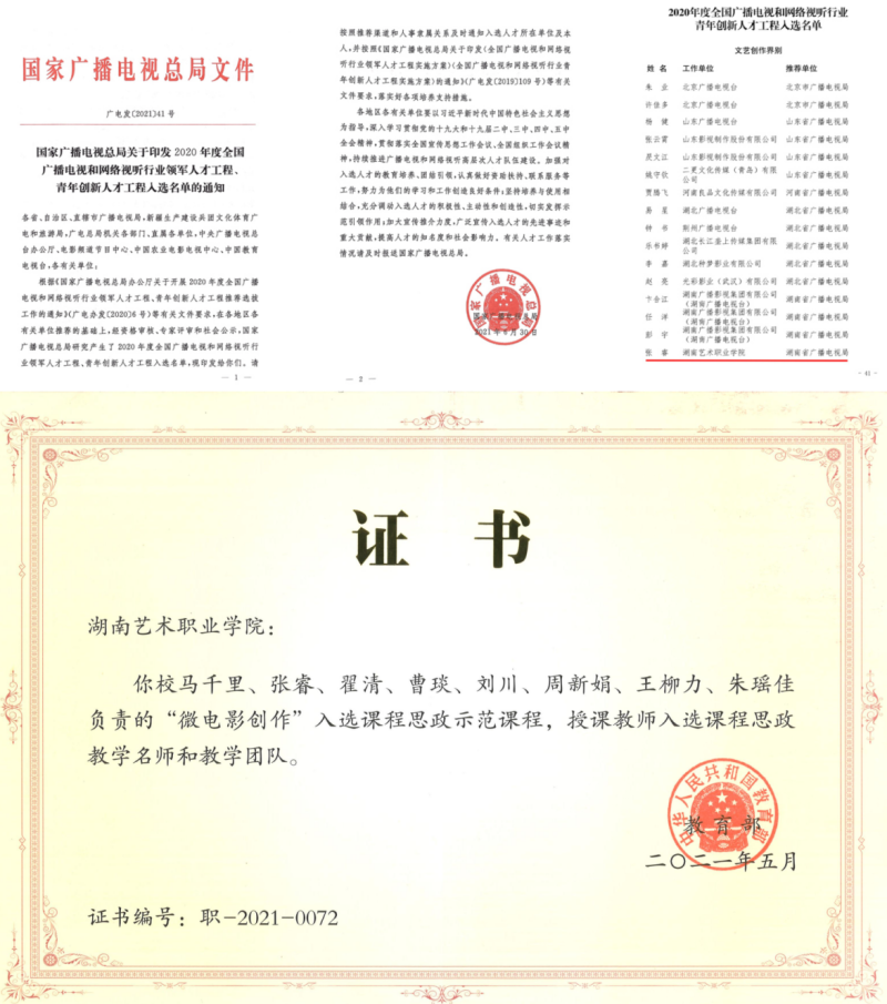 图6 《微电影创作》课程入选教育部课程思政示范课、授课教师入选课程思政教学名师和教学团队证书及国家广播电视总局2020年度全国广播电视和网络视听行业青年创新人才证书