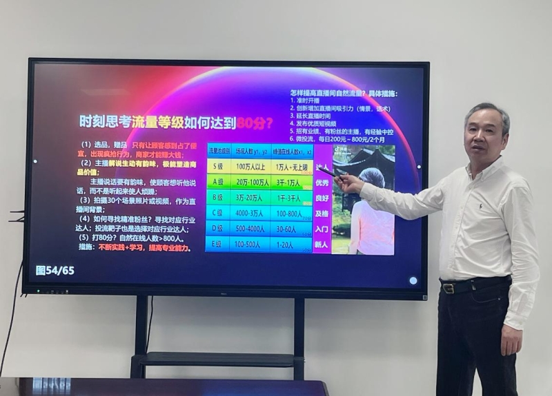 聚焦行业痛点,谢方教授系统梳理关键技能:围绕“规范意识”,详解直播违禁词动态管理机制,强调合规运营的底线思维;针对“技术逻辑”,通过对比抖音直播与短视频双推荐系统的运行差异,阐释精准流量获取策略;结合“运营创新”,借助公私域流量联动典型案例,剖析用户价值深度挖掘的方法路径;聚焦“转化技巧”,现场播放案例视频演示情感共鸣与价值传递的话术设计,提炼提升直播转化效率的实战要领。